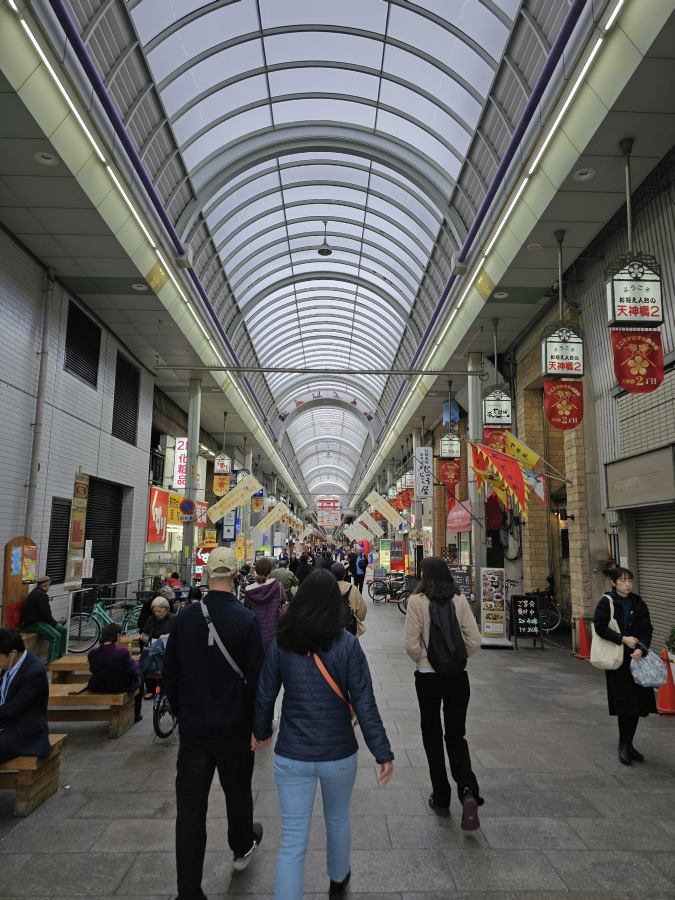 Innen kb. 200 méterre kezdődik a város egyik legismertebb fedett bevásárlóutcája, a Tenjinbashi. Ez egy közel 1,5 km hosszú utca, tele üzlettel, kifőzdével. Érdemes legalább egy részén sétálni, itt is relatíve kevés turista volt.