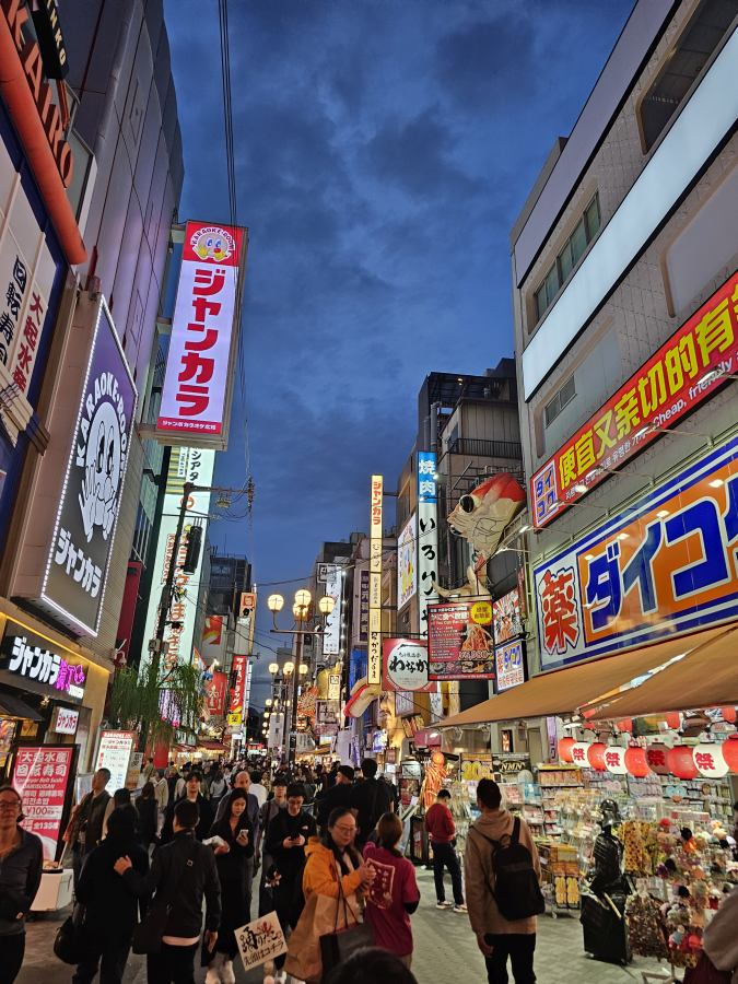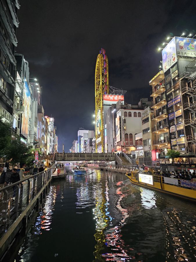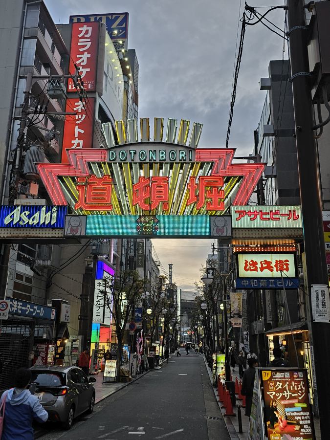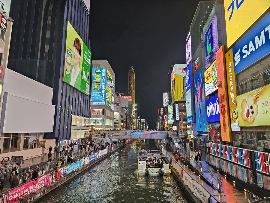 Vasárnap a szállás elfoglalása után egy hely volt tervben, a Dotonbori. Ez a folyóparti sétány Oszaka egyik kedvelt helyszíne, főleg este. A legtöbb ikonikus kép itt készül, ahogy a neonlámpák végig kivilágítják a partot. Rengeteg üzlet, étterem, bár van a folyó mentén és a környező utcákban. A folyón pedig folyamatosan közlekednek a turistahajók. Érdemes itt céltalanul sétálni és élvezni a látványt.