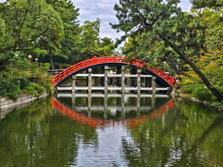 A park délkeleti sarkán van a Tennoji állomás, aminek környéke mozgalmas negyed. A déli oldalról induló villamosra szálltam (Hankaidenki-Uemachi vonal), amivel a szintén népszerű Sumiyoshi Taisha sintó szentélybe utaztam. A villamos régi stílusú, nagyon hangulatos rajta utazni. Érdekesség, hogy a hátsó ajtón kell felszállni és az elsőnél leszállni, ekkor kell kifizetni a jegyet. A szentélynél – mivel kijjebb esik a belvárostól – szintén kevesebb turista volt. Elég nagy területen fekszik, sok kisebb szentéllyel. És itt is egy piros híd az egyik ikonikus látnivaló.