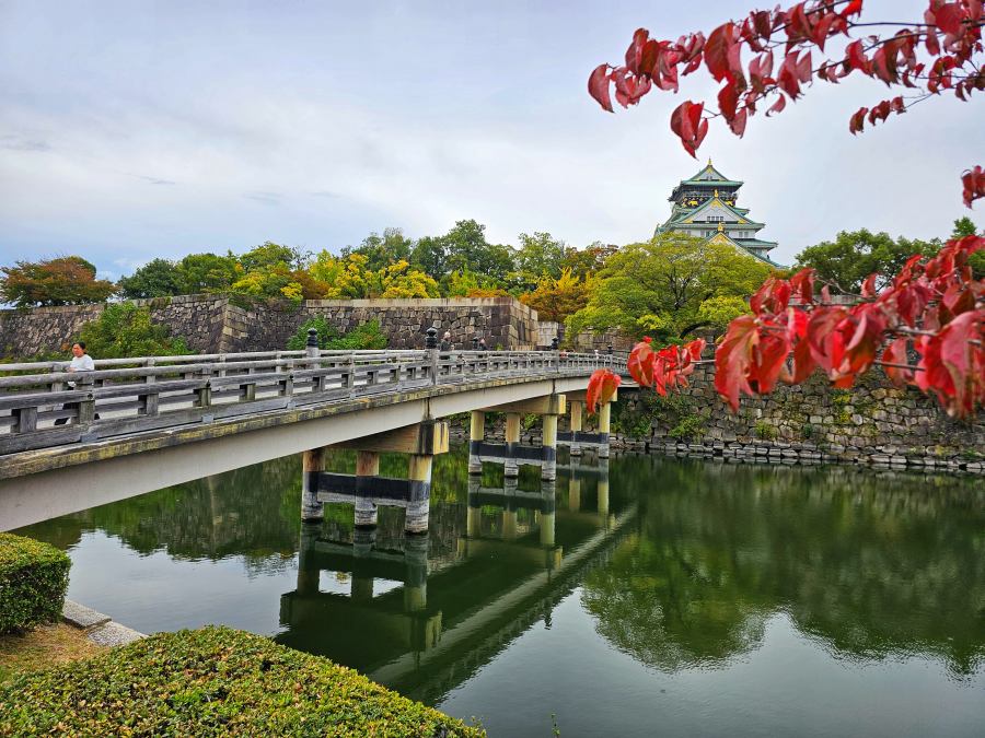 Mivel gyalog kb. 15 percre volt a szállástól az oszakai vár, ezzel kezdtem a napot. Érdekes látvány, ahogy egy nagy felhőkarcoló mögött ott áll egy erődszerű területen a tipikus japán stílusú várkastély. A déli oldalról menve egy park közepén található az épület, a várfalakról pedig minden irányban remek a kilátás. Az északi oldalon van a legszebb bejárat, a Gokuraku-bashi fahíd. Innen csodás képeket lehet készíteni.